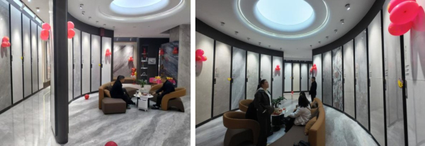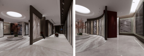 步入空间,映入眼帘的是强辉精工瓷砖金属质感的LOGO,在岩板背景墙衬托下熠熠生辉,地面纹理如自然脉络般舒展,营造出浑然天成的视觉韵律。