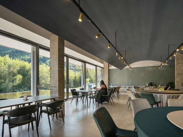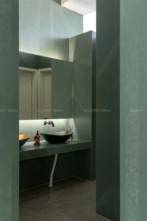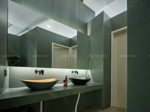 晴餐厅及卫生间的墙面都选用了「冠珠华脉岩板-敦煌印象-绢绘 矿石绿」,其灵感源自敦煌壁画中矿物颜料,质感天然,呼应了莫干山竹海的苍翠记忆。