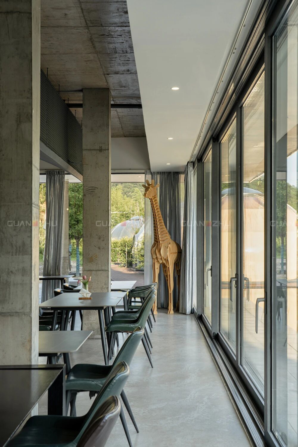 在承载用餐、交流与接待等多重功能的同时,晴餐厅也面临着高频使用与维护的挑战。主理人俞棡分享:“作为人流量最大的区域之一,这里常有旅客拖着行李箱穿梭,对地面材质是极大的考验。冠珠岩板以其卓越性能,从容应对高频使用。表面致密耐磨,污渍一擦即净,大大降低了日常维护成本”。