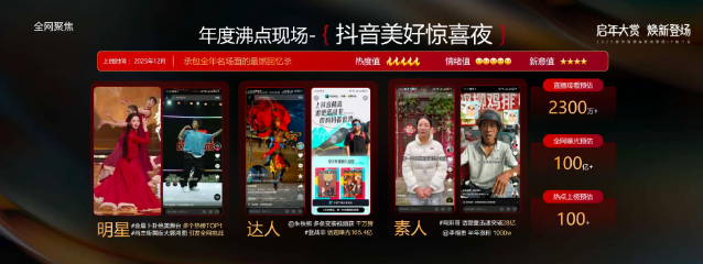 在跨年节点,跨年晚会和跨年演唱会是最受年轻人欢迎的仪式。「抖音美好惊喜夜」是抖音平台的跨年晚会,既有过去一年抖音上各种名场面、标志性人物集体回忆杀,又会制造大量新热点上榜,百亿级曝光,热度值和欢乐值拉满,情绪普适性高,非常适合品牌打开认知度、好感度。