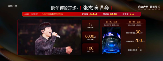 「张杰跨年演唱会」已经是连续第三年跟抖音合作了,2026年舞台将全面升级,作为内娱顶流实力唱将,张杰覆盖全网1亿粉丝关注,2025年跨年演唱会相关热点持续在榜长达30多天,表现出强大的长尾效应。此外,元旦假期期间,抖音还有「潘玮柏巡回演唱会抖音特别场」「林忆莲新年回响演唱会」等多种资源,适合品牌根据目标受众进行深度圈层渗透。