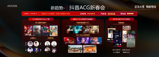 2026年抖音将举办首届ACG新春会大联欢,邀请王者荣耀、三角洲等顶流IP合作,众多头部达人加入,丰富的内容和互动参与机制将惊喜满满。众所周知二次元的消费力惊人,也是许多品牌重点关注的圈层人群,这样一场属于二次元自己的春晚也将是品牌攻略二次元人群的好机会。