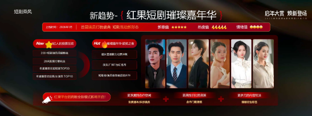 短剧爱好者有福了,新年之际将迎来「红果短剧璀璨嘉年华」,届时将举办首届红果短剧演员打榜盛典,通过20天的线上投票以及一场超长拉票直播借力,由观众票选出年度最受欢迎的短剧和演员,并举办盛大的颁奖典礼。与此同时,红果将推出全新的招商剧模式,品牌合作门槛更低、合作空间更大、内容玩法更多元,对于有志于短剧营销的品牌而言十分值得关注。