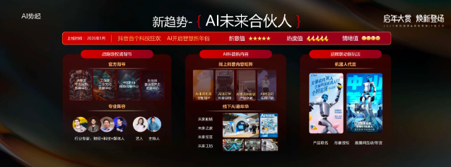 科技硬核爱好者也有自己的“春晚”,抖音将举办首次「AI未来合伙人」活动,邀请官方机构、媒体以及专家达人共同进行AI相关知识科普,通过线上科普内容和线下AI嘉年华结合,打造一场科技盛典。结合IP项目,平台将推出机器人代言新玩法,通过产品联名、形象授权、进入直播间互动等形式,让 AI赋能营销。