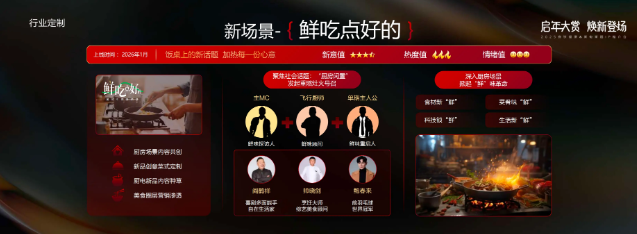 「鲜吃点好的」则是走进年轻人被闲置的厨房,通过重燃厨房的灶火帮助他们重启鲜活的生活,对于食品饮料、调味品、厨房用品等品牌均有种草空间。