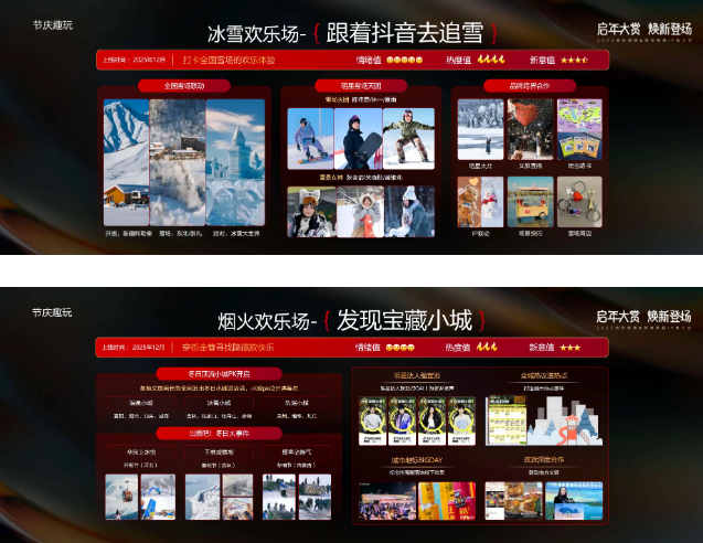 基于春节出游热点,抖音生活服务打造了「跟着抖音去追雪」「发现宝藏小城」等IP项目,前者与全国雪场以及哈尔滨冰雪大世界深度联动,展开线上内容和线下文旅全方位合作,为用户提供欢乐冰雪体验;后者则深入有特色的小城,譬如温泉小城、洗浴小城以及冰雪小城,带领用户走街串巷去寻找一些不踩雷的快乐。