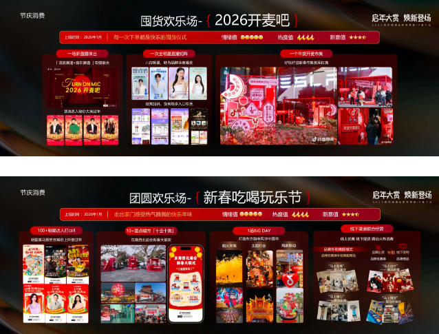 针对年轻人的喜好,抖音将在春节期间推出多个既有好东西、好价格又有欢乐好体验的IP项目,满足用户边玩边买的诉求。例如,抖音电商年货节将推出「2026开麦吧」IP,邀请喜剧界、音乐界的顶流艺人一起陪大家大笑过年,并且会进入品牌直播间陪大家一起挑选年货,让每一次下单都是快乐的囤货仪式。此外,抖音本地生活服务将推出「新春吃喝玩乐节」,邀请100个以上的明星达人一起走出家门展开一场全国范围的吃喝玩乐狂欢,抖音将在全国50多个重点城市设立线下欢乐场,和各地庙会结合起来提供热闹年味和丰富体验,将为本地商家带来巨大流量机会。