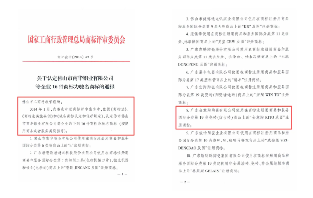 广东金意陶陶瓷集团有限公司自2004年开始,创立了国际化的高端品牌“金意陶(KITO)”,是第3254530号、第3550212号注册商标的权利人,而且第3254530号商标在2014年更是被评为瓷砖商品上的驰名商标。