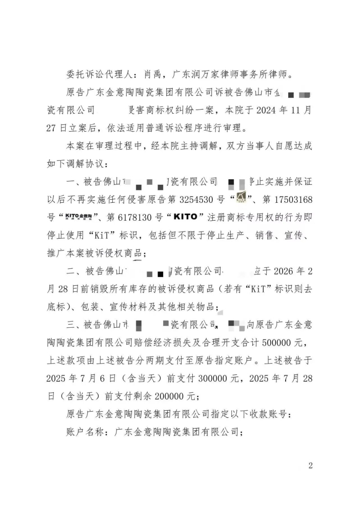 在金意陶公司诉被告佛山市金拓某陶瓷有限公司、罗某使用“KiT”标识,侵害金意陶商标权一案,双方在法院调解下达成协议,被告承诺停止侵权,销毁所有库存的被诉侵权商品,并赔偿50万元。