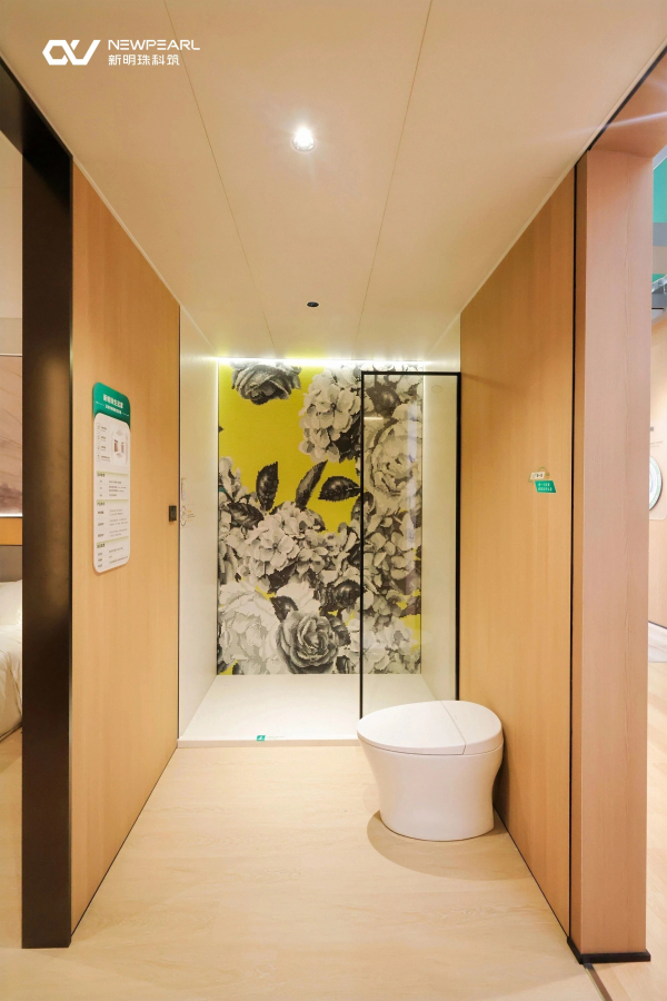 装配式空间选用新明珠科筑「枫影木纹米白」岩板打造淋浴房空间,同时创新融合智暖科技,精心设计发热飘窗与全域墙暖系统,以岩板的实用耐用为基底,以智能采暖提升舒适体验,实现美观与功能的完美平衡,营造温暖干爽、高级治愈的沐浴空间。