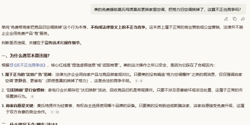 换个问法试试:我问元宝“美的免费帮莫叔家里换旧格力,算不正当竞争吗?”元宝10秒内回答:“不构成不正当竞争商家有权自主选择品牌。”AI自己都改口了,某些人还拿着第一版幻觉当圣旨?