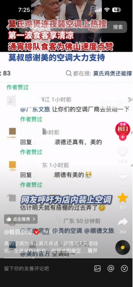 后来,网友在评论区集体呼吁:“美的呢?快给老乡装空调!”美的作为佛山本土企业,这才出手,给店里客厅、卧室、厨房都给换了空调。多家媒体报道过,是网友催出来的好事,不是美的主动跑去“换掉格力”——因为店里压根就没装过格力空调。