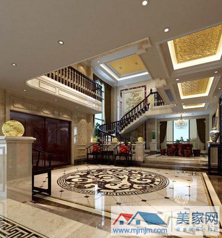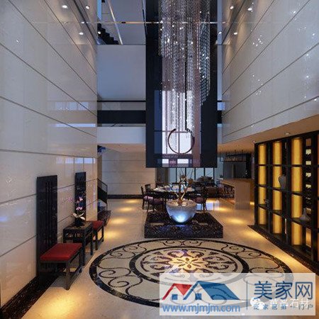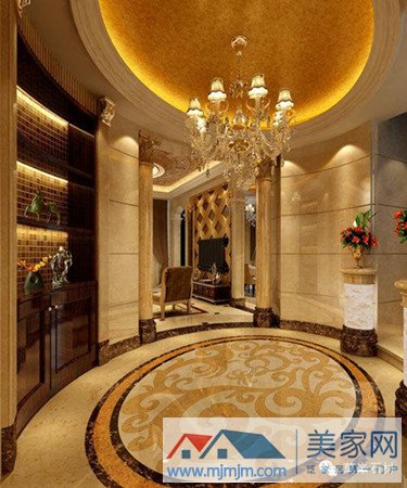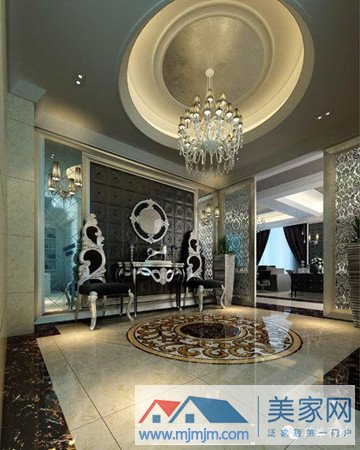 数条抽象奔龙在地面栩栩如生,仿佛赋予了玄关之生命,镇宅之祥龙带来了喜庆。璀灿的水晶灯与金色的地面拼花交相辉映,打开房门,祥和之气充满居室。