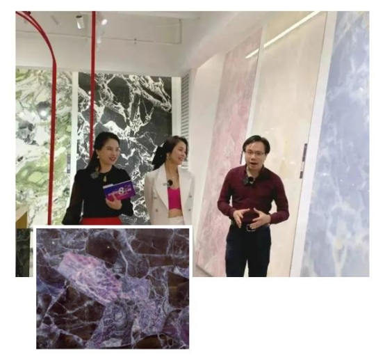 森蒂岩板总经理陈效东从浅谈行业趋势、森蒂岩板产品工艺等多维度多方面进行讲解。其中谈到,森蒂岩板目前正从1.0产品向2.0产品过渡升级,从满足功能性实用性需求向满足空间的美学性升级。随后陈总还带领莹姐和YOYO到蒙诺设计,将每一款产品还原最细腻、最真实、最自然的肌理质感,逼真感和震撼感十足。