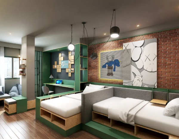 作为一个创新品牌,陶瑞酒店设计一些服务于年轻人成长的特色空间,来实现满足其阶梯式住宿需求(集宿-长短租-游学-科研接待)和功能配套服务(青创孵化研学/办公+租住融合房型+人文社交空间)。