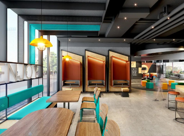 轻体验的瑞境孵化巢,采用常规大堂和贴心配套(无线充电+伸缩台灯+储物盒)的组合,提供包含创业空间租用、配套高效服务,更可有效利用高校独有的学科资源及商业共享资源为创业孵化提供增值服务。重体验的灵感感梦工厂,通过阶梯教室的打造,可将年轻人喜闻乐见的脱口秀合作等形式引入酒店空间,使其成为充满睿趣的沙龙场地。智汇补给站,集合智汇吧+自助餐厅+店中店于一体提供24H运营。