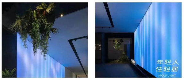 在空间管理和设计美学上,轻居3.0系列以时尚、质感的水空蓝为主基调,叠加“漂浮岛”式样的橱窗,拟真海浪LED屏装饰的过道,以及“小巷”概念串联起的内外空间。把大海和小巷搬进酒店,松弛在于舒缓有度、惬意又深邃,营造了一次短途的探索与发现之旅。