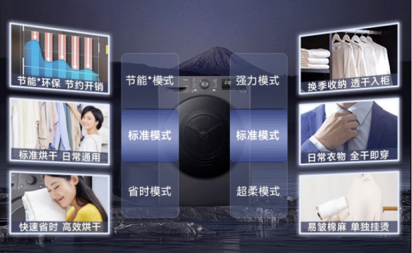具体到衣物的烘干护理表现上,LG星云黑洗烘套装秉承“低温更护衣”原则,在双变频精控温效的加持下,智能检测衣物含水率,使纤维表温始终保持在45°左右,减少因温度导致的衣物损伤,无论从产品性能还是稳定性上,都有着绝对的优势,既护衣又节能省电。更设置多种洗烘方式,供用户轻松掌控。14min快洗+30min快速烘干,轻质衣物不久等,干爽洁净速达;双变频热泵精准控制冷循环速度,让更多可选择的烘干模式得以实现,一级能效标准,6种烘干模式,包括节能模式、强力模式、超柔模式等,随心随需自由选择。