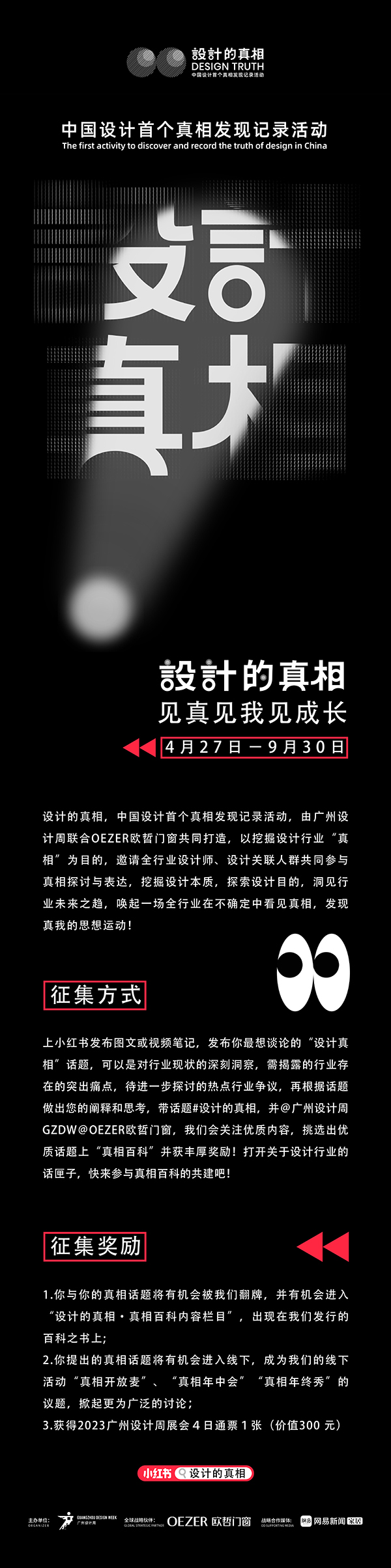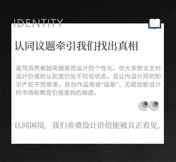 我们发起“真相百科”征集,联动权威媒体加持助力,持续生产话题内容造势,是想以共创为原点延续思考,为设计关联人群提供全新的观点表达与交流的契机,共同讲述与揭露那些设计行业背后的秘密。最终,征集而来的“设计真相”将会收录在“真相百科”里发行,让真相价值有迹可循。