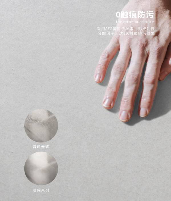 在工艺上,肤感系列采用第三代肤感釉,砖面SCI亲肤指数提升16%,更为细腻平滑,无橘皮效果,摸起来如同奶油肌般柔润。