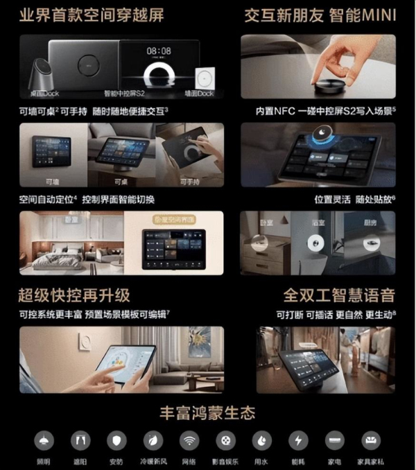 2023年5月18日,华为夏季全场景新品发布会举行,重磅发布华为全屋智能4.0。作为空间智能化的引领者,华为全屋智能聚焦核心交互和子系统升级,推出业界首款空间穿越屏智能中控屏S2、交互家族新朋友智能MINI,超级快控及智慧语音新升级,叠加不断扩展的鸿蒙生态,重构人与空间关系,实现空间交互跃变,掀起一场空间交互革命。