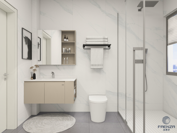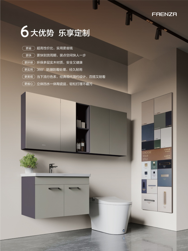 卫浴空间作为人们自由独处的避风港,整洁有序的空间环境是刚需,浴室柜则是卫浴收纳必不可少的家具。结合用户的卫浴智能化和收纳需求,FAENZA法恩莎推出了【轻享生活·随心所浴】方案,以轻定制实现卫浴空间的全面焕新,还可享受自由选配侧挂柜、马桶侧挂柜、马桶挂柜三款配件,让用户乐享DIY权益,打造专属于自己的浴室空间。
