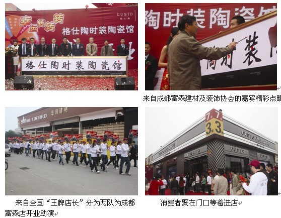 开业当场记者采访成都富森店总经理范成科时,他说:此次建店是软硬兼施分步进行,在他09年去欧洲参观博洛尼亚陶瓷展会回来之后,心里就暗暗下决定,一定要在成都市最高档、品牌最集中的建材市场中拿下一个黄金位置的终端展示店面。将成都格仕陶终端展厅“改头换面”,一是为了更好地展示产品,巩固市场份额;二是为二、三级分销商树立榜样,带动他们的销售热情。