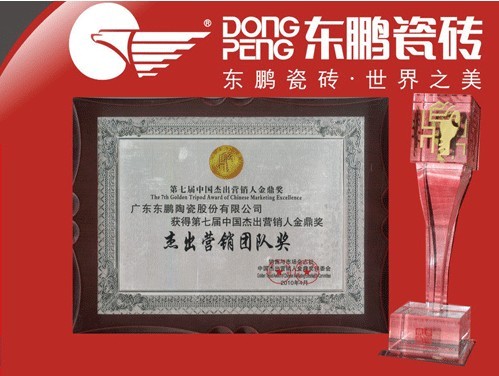 4月17日 —18日,“第七届中国营销论坛暨中国杰出营销人金鼎奖颁奖典礼”在北京万豪酒店举行。东鹏瓷砖国内销售部凭借其在2009年的突出表现,在众多强手中脱颖而出,勇夺“杰出营销团队奖”,同获该奖项的有将王老吉成功打造成“中国饮料第一罐”的加多宝集团市场部品牌管理中心等企业精英团队,这是建材行业在该项评比中获得的唯一奖项。