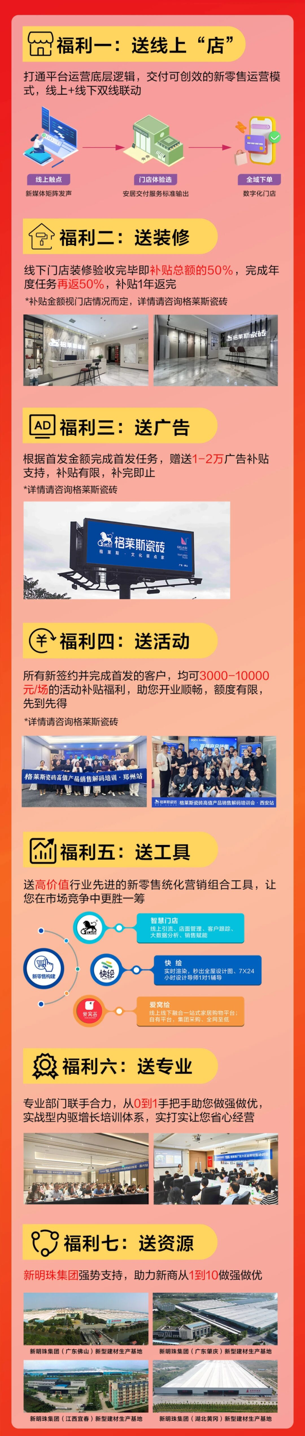 格莱斯瓷砖本次的招商计划聚焦新媒体渠道,利用“抖音、视频号、腾讯搜索”三大引擎联动,充分发挥互联网优势,精准触及更多潜在客户。同时,品牌更推出创富7连送,助力新商快速盈利,还给予专业帮扶指导助力新商成长。