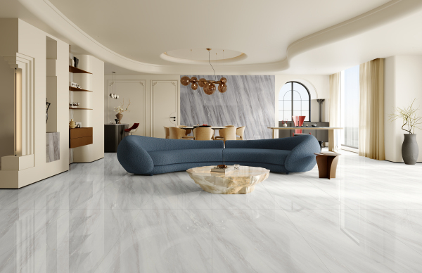 「宋境·玉」运用45°柔拋工艺,让砖面更加接近天然石材的光感,柔光质感更加高级,用在客餐厅、卧室光感非常舒适;叠加了冰晶干粒,光感细节更加丰富精致。