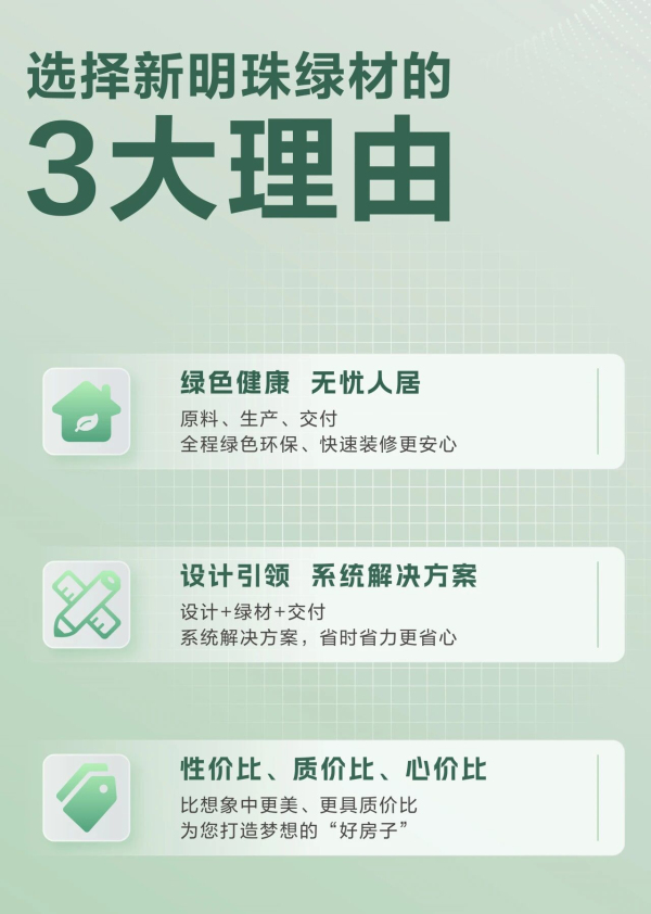 以绿材之名,践行低碳绿色环保可持续的使命,新明珠绿材应势而生。紧跟新明珠集团的战略目标,新明珠绿材致力于成为绿色建筑空间和美好人居生活提供解决方案的服务商。依托“设计研究 + 绿建新材 + 精工交付”的新明珠“N+N”整体空间解决方案,助力人们实现对健康人居环境和美好生活的追求。
