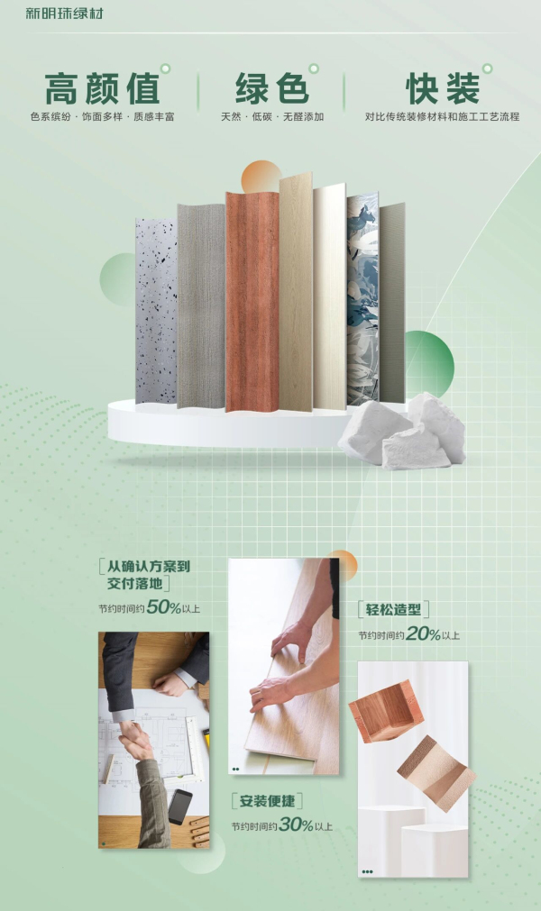 同时,新明珠绿材凭借环保、快装、耐用等核心优势,在旧房改造领域展现出巨大潜力。无论是家居焕新、商业空间升级还是城市更新,干法施工、免砸免拆、即装即用的特点,能最大限度地缩短工期、减少建筑垃圾,让更新项目变得更高效、更环保。