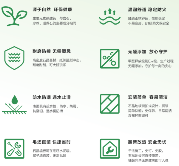 石晶墙板绿色环保、性能优越,具备“防水防潮防霉、耐磨抗撞耐用、稳定防火”等优点,加上安装便捷的优势,普遍适配于住宅、公寓、酒店、学校、文体场馆、医疗康养、旧改等领域。