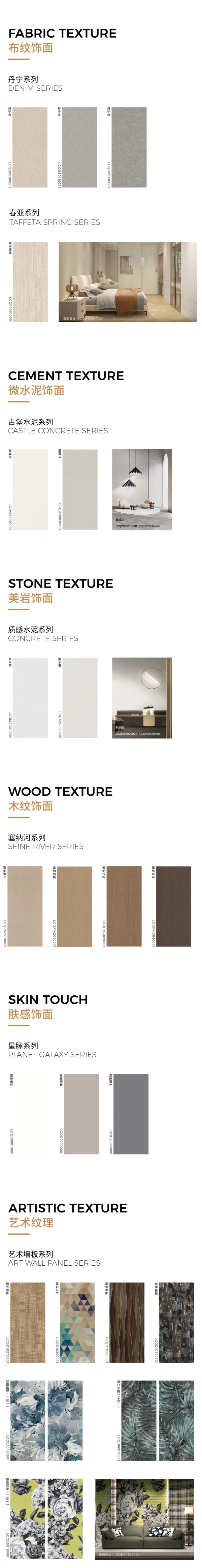 石晶墙面系统有“春亚系列、丹宁系列、星脉系列、质感水泥系列、古堡水泥系列、塞纳河系列、花片系列”,纹理、花色与质感丰富多元,全面满足高端设计与个性化空间的营造需求。