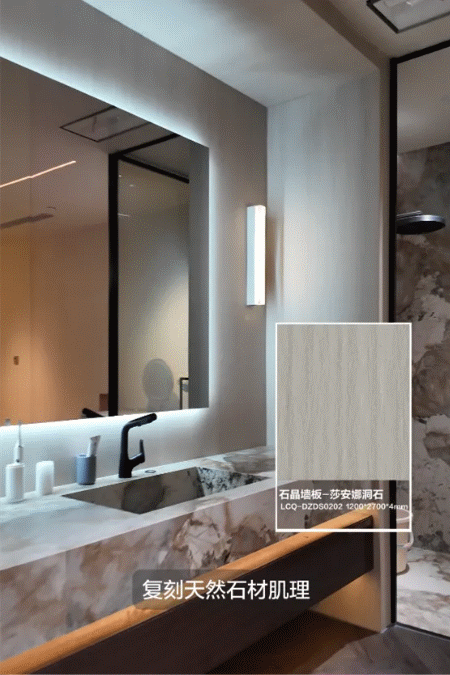 石晶墙板“莎安娜洞石”复刻天然石材的细腻纹理与质感,防水防潮防霉、抗撞易洁的性能,在营造沉稳大气空间氛围的同时,确保持久耐用。
