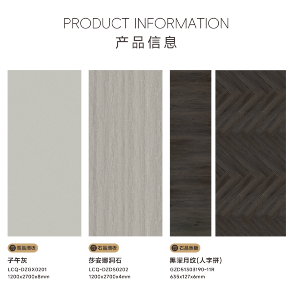 项目主材:石晶地板(黑曜月纹-人字拼)、石晶墙板(莎安娜洞石)、雪晶墙板(子午灰)