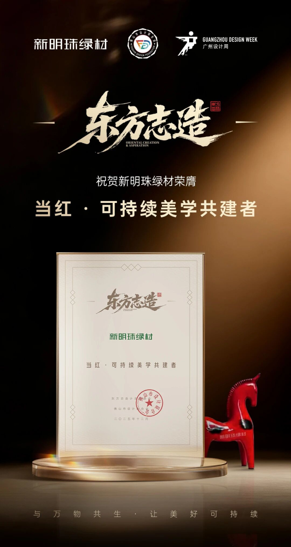 基于在绿色材料研发与美学价值创造方面的持续贡献,新明珠绿材在授牌仪式中荣膺“当红•可持续美学共建者”称号。这一荣誉是对品牌坚持“科技、绿色、美学”融合发展战略的权威认可。