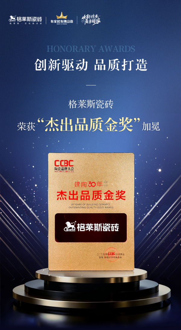 近日,在第十五届陶瓷人大会暨2025陶瓷品牌大会上,格莱斯瓷砖凭借卓越的产品实力与持续创新,荣获「建陶30年·杰出品质金奖」!这不仅是一份荣誉,更是对品牌24年来始终如一的品质坚守与美学追求的高度认可。