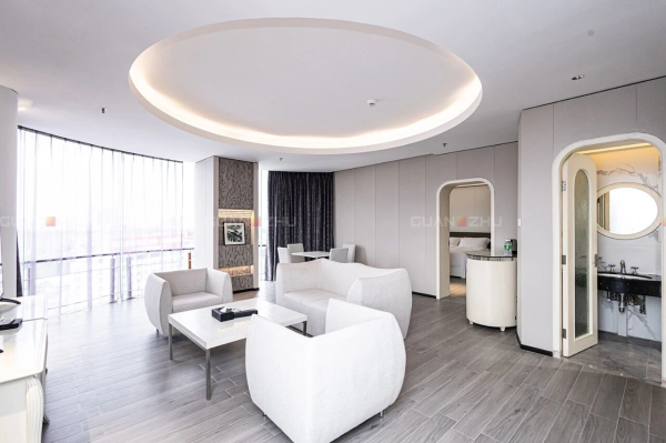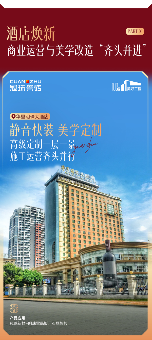 作为新明珠集团旗下高端商务酒店,华夏明珠大酒店对于住客的居住体验有着极致的追求。本次全面焕新工程中,在不影响酒店正常运营的前提下,冠珠新材突破性地实现了“一层一景的空间美学定制”与“零干扰快装”,美学改造与商业运营两不误!