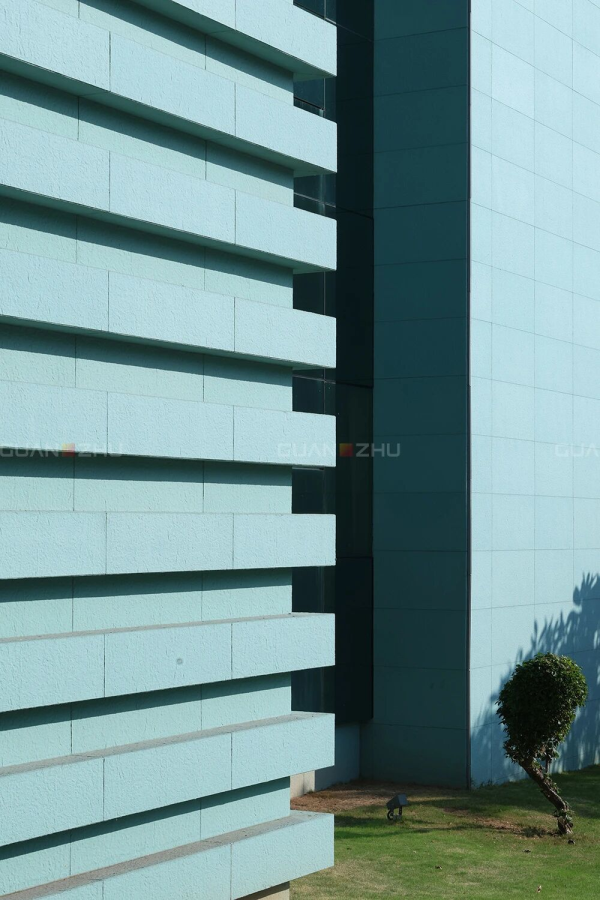 建筑外墙采用了定制化的蓝色生态软瓷。其极致轻薄的特性显著降低了原有建筑的荷载压力,同时,卓越的防水、防火、耐候及抗紫外线性能,确保了建筑外立面在各类气候条件下都能历久弥新,持久维持简洁明快的视觉效果。