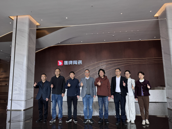 佛山石湾鹰牌陶瓷有限公司作为拥有50年历史的行业领军企业,其晶聚合技术(晶聚合4.0)让调研团队印象深刻。该技术突破传统微晶石不耐磨、硬度低的技术瓶颈,产品莫氏硬度达6级,耐磨性接近抛光砖,技术达国际领先水平。鹰牌的高透原石系列采用数码微刻技术+12通道多色域喷墨打印,1:1精准复刻天然大理石纹理,智能亮抛工艺实现95°以上高透光感。其通体仿古砖实现坯体与面釉色彩一致、纹理贯穿,解决了传统产品在倒角、开槽后纹理中断的问题。交谈中,双方重点探讨了汝瓷非遗工艺与现代设计融合、品牌文化建设与国际化发展等合作方向。