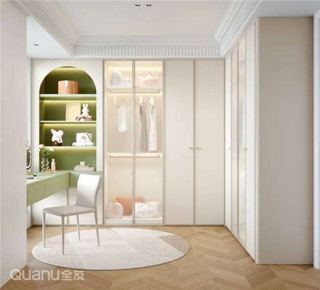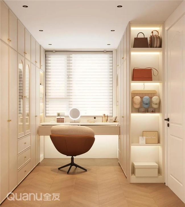 如果你是美妆达人或配饰爱好者,一个独立美妆间更能满足需求。我们利用房间三面墙定制U型布局,整合衣柜、梳妆台与展示收纳。梳妆台面向窗户,保证自然光线;台面与柜体衔接处设计开放格与抽屉,化妆品、工具一目了然。衣柜内部按“多挂少叠”原则分区,衣物配饰井井有条。