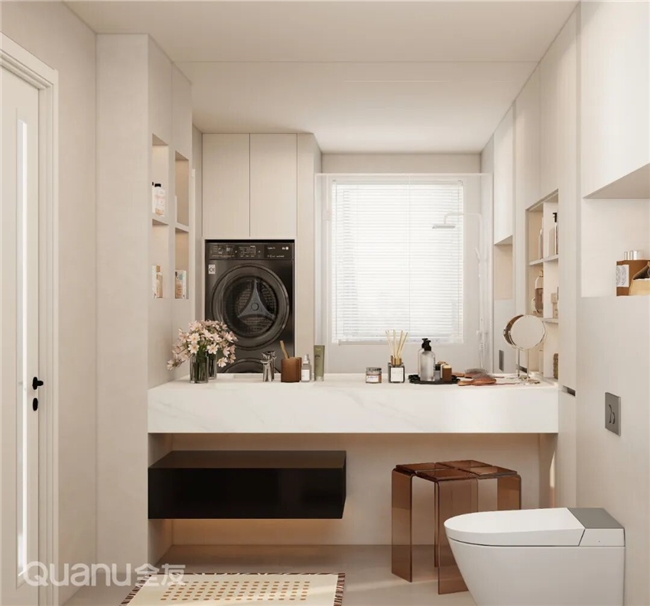 如果主卫实行干湿分离,我们可将洗漱区进行功能延伸。定制加长台面,一端洗漱,一端梳妆。侧面墙面设计壁龛或嵌入式收纳柜,让护肤品、化妆品、首饰各有其位。早上打扮一气呵成,晚上卸妆收纳一步到位,小户型也能拥有高效精致的梳妆体验。