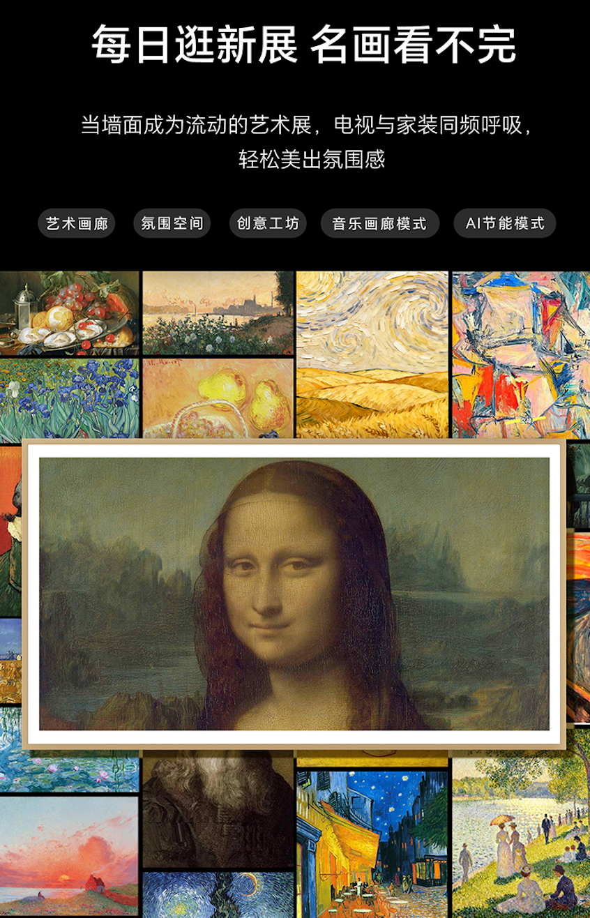 与此同时,创维壁纸电视还内置了「百变艺术屏」,超千幅世界经典名画壁纸资源终身免费提供,让电视在不用时,也不再是一块突兀的黑屏,而是可以随时更换的“百变艺术画廊”,客厅氛围随心变化!
