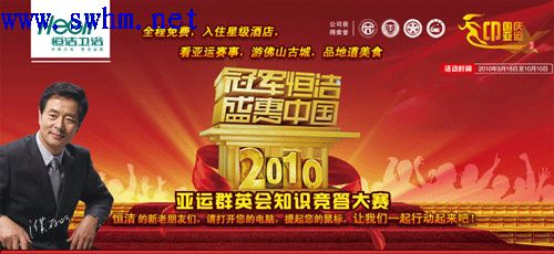 走进亚运•佛山,走进佛山•恒洁。免费住星级酒店、免费观亚运赛事、免费游佛山名城、免费品地道美食,尽在“恒洁.亚运群英会—知识竞答大赛”。借举国欢腾之时、亚运来临之际,针对网络用户追逐时尚、引领潮流的生活态度,恒洁卫浴将时下最流行的网络活动与亚运相结合。9月18日日起至10月10日,只需打开电脑,提起鼠标,进入“冠军恒洁,盛惠中国——亚运群英会知识竞答大赛”即有机会获得“四重免费”大礼。