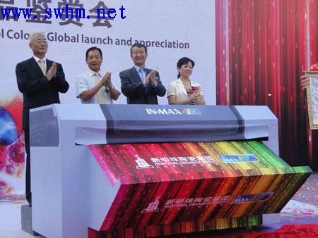 发布会上,新明珠集团总裁叶德林等领导从“打印机”上取下“新鲜出炉”的产品交给四大品牌负责人,预示着新明珠集团“IN-MAX·酷色”数码喷墨印花技术产品正式进入新明珠的产品序列!