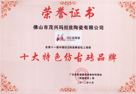 此次评选活动的获奖企业都是在行业内具有特色的企业,授予荣誉正是为了彰显代表企业的独到之处,树立行业标杆,推动仿古砖的积极健康发展。玛拉兹也将肩负起使命,以不断壮大之势回馈社会,回馈行业,回馈消费者。
