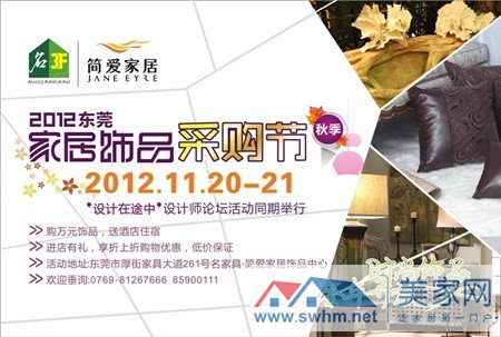 2012东莞家居饰品采购节(秋季)将于2012年11月20-21日在名家具•简爱家居饰品中心(即名家具展2号馆)隆重举行。