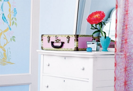 设计师在淡蓝色墙体上装饰白色木框,醒目而富有艺术气息。蓝色作为室内主色调,不但为夏天带来清凉氛围,还能够包容粉色、橘色点缀带来的视觉刺激,起到平衡的作用。蓝色还能营造浪漫风格,将鲜花、水晶、镜面等装饰品和谐的融进整体空间。