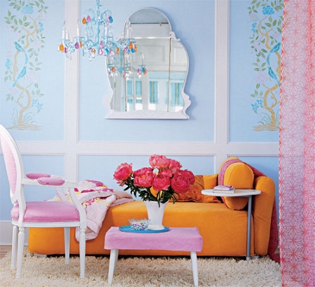 亮色搭配富有韵律节奏亮橘色是耀眼而高贵的颜色,粉色、浅蓝都是记忆中最天真的童话色彩,艳丽与柔和相搭配,组合出纯度很高的居室一角。三种色彩在墙面、沙发、茶几甚至水晶吊灯之间错落搭配,形成视觉上有节奏的韵律感。(美好家园)